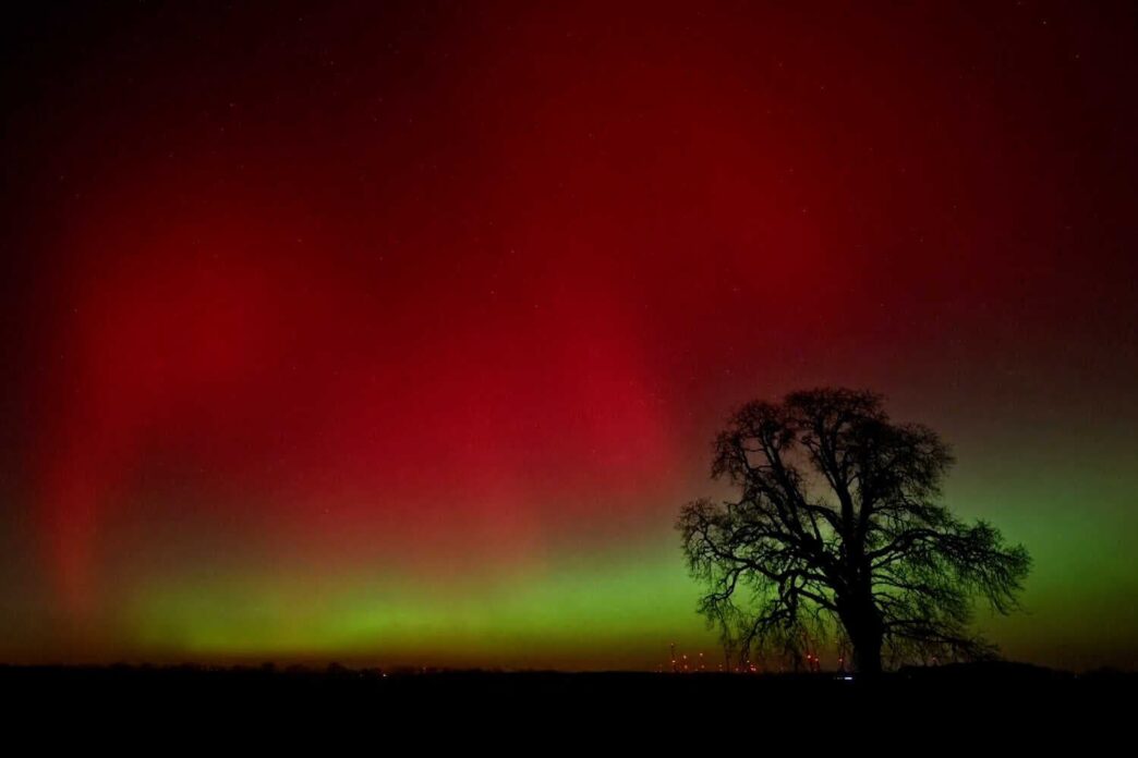One of the largest solar radiation storms in decades produced an aurora borealis that illuminated rare hues like red and purple over Britain and parts of continental Europe.