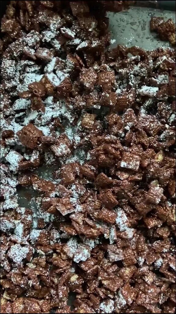 Puppy Chow is Chex mix coated with melted peanut butter and chocolate and then doused in powdered sugar. Step one of this very complicated recipe, put the cereal in a big bowl. Combine the chocolate and the peanut butter. You can do the melting of the chocolate and peanut butter either on the stove or in the microwave. Now’s the time to add a little vanilla. So now, the chocolate is going over the cereal. It’s going on a sheet pan. Nudge it around in an even layer. Sprinkle a little sugar, a little salt. Stir to combine, and keep repeating this, until you’ve used all the sugar. Come on, look how good that is.