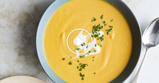 Spicy peanut and pumpkin soup. It’s actually based off of a recipe for maafé, which is a pretty common recipe in West Africa. It’s a spicy peanut soup. So my oil is shimmering. Onions, ginger and garlic — sautéing until the aromatics are softened and fragrant. If you want the oils of the chili without the heat, just drop it in whole. Seeds are really where the heat is. I’m going to add my half-chili, canned pumpkin, storebought vegetable stock. Let this come up to a simmer. Coconut milk, a natural peanut butter that just has peanuts and salt, honey to round out the soup. And I’m just going to throw this in the blender. So, this is just a topping that I’m adding for a little texture. The heat starts to transform the peanuts. Just going for a rough chop. Mm, that’s beautiful. It’s so smooth. The chopped chives are just a little pop of freshness.
